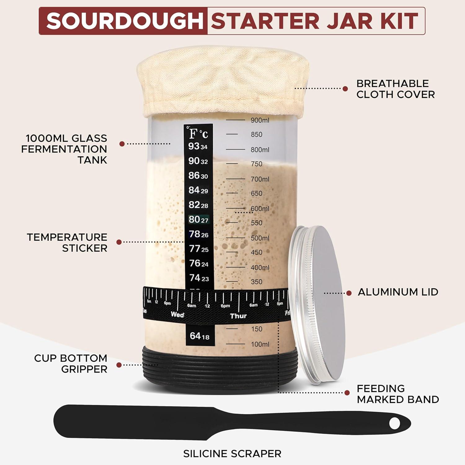 EcoNour 1000 ml Sourdough Starter Kit | 34-oz Glass Sourdough Starter Jar with Thermometer, Spatula, Cloth Cover | Date-Marked Feeding Band-Ideal for Beginner's | Bread Fermentation & Baking Essential