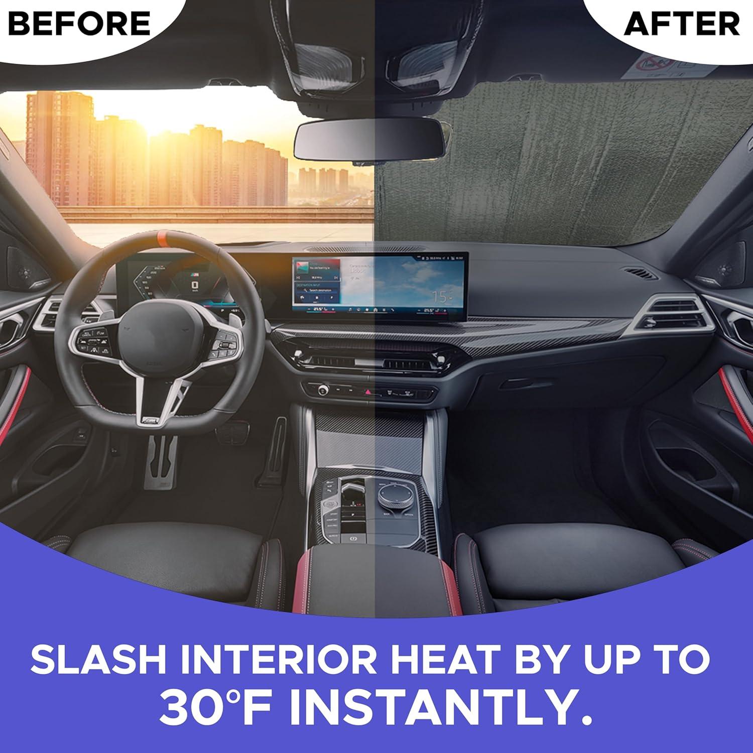 Unrivaled Durability: Our Windshield Sunshade is designed by a “durable double layer bubble design” which offers a secure fit across all corners and provides outlasting protection. It also helps to Count on superior longevity and effective UV and heat ray blockage.