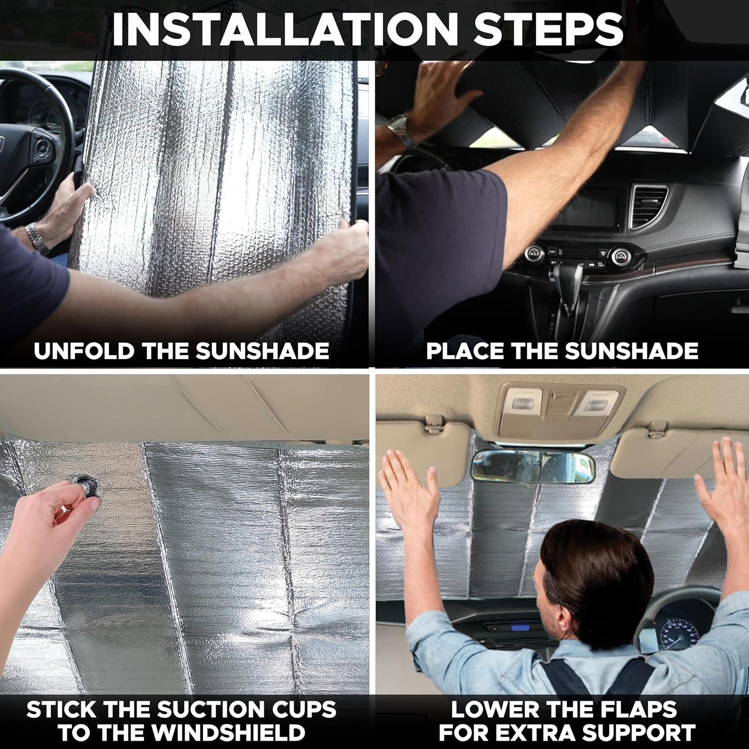 Effortless Installation and Storage: Our user-friendly double foldable design ensures easy installation without any hassle. Simply place the sunshade against your windshield, lower the overhead sun visor for added support, and fold it away (can be double folded) using the buckled strap when not needed.