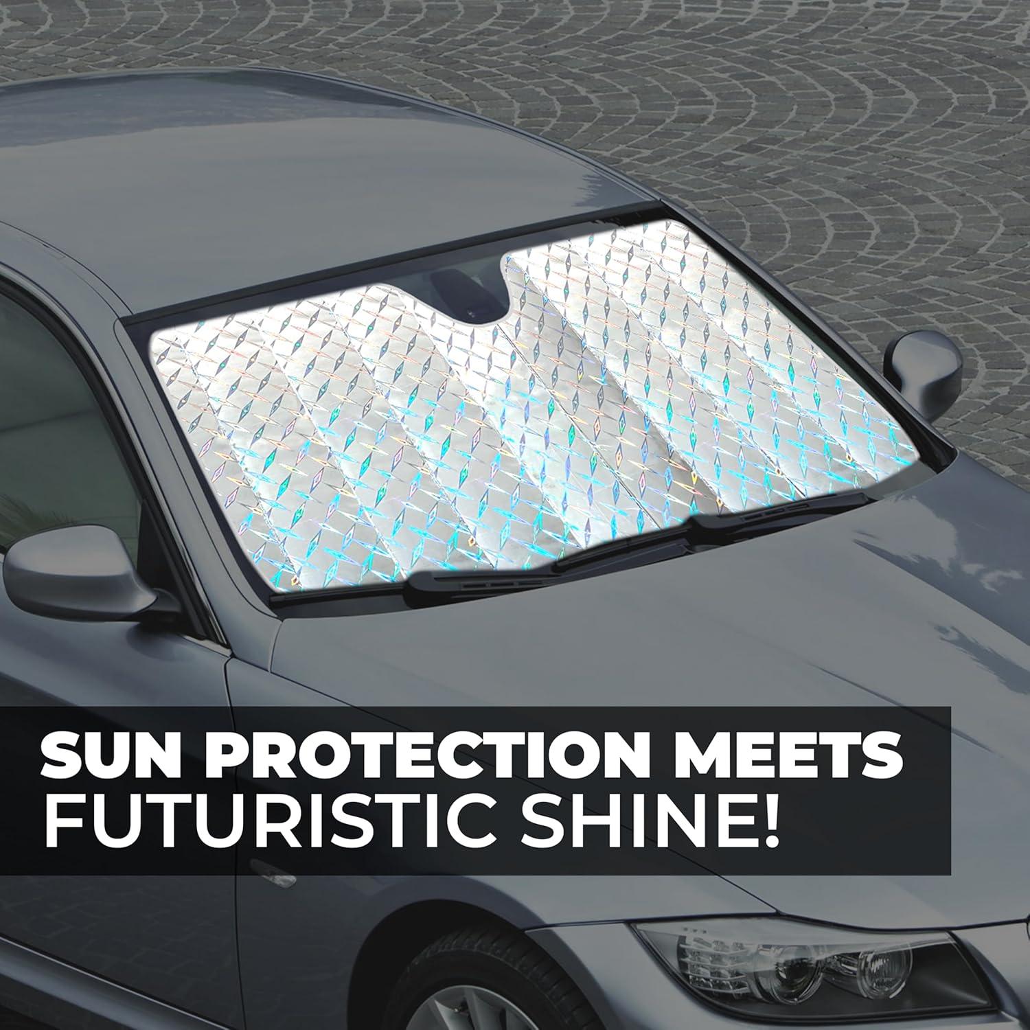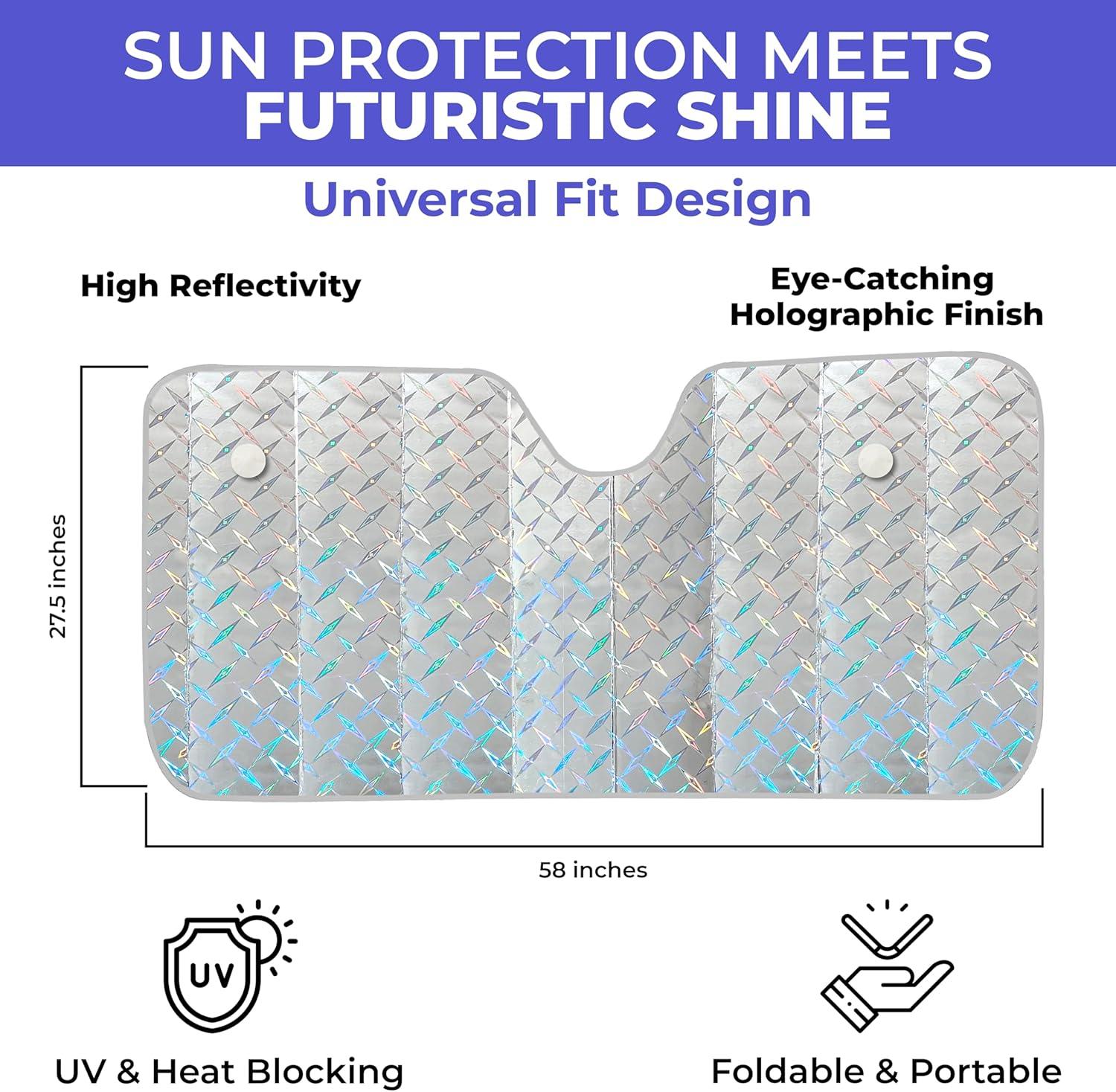 EcoNour Accordion Foldable Windshield Sun Shade | Jumbo Sun Visor for Truck Front Windows | UV & Heat Reflective Sunshade with Durable Dual-Layer Design | X-Large (66" x 27")(Holographic silver)