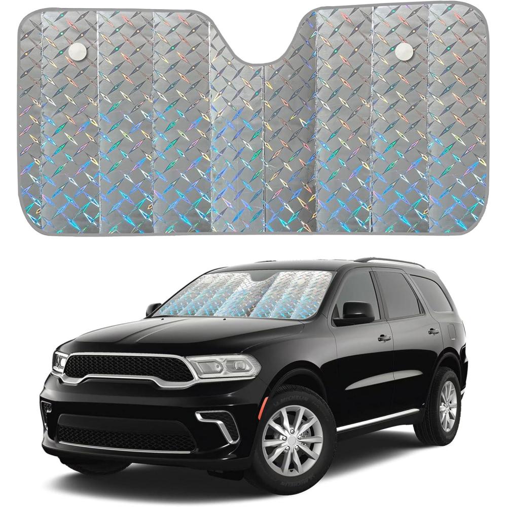 EcoNour Accordion Foldable Windshield Sun Shade | Jumbo Sun Visor for Truck Front Windows | UV & Heat Reflective Sunshade with Durable Dual-Layer Design | X-Large (66″ x 27″)(Holographic silver)