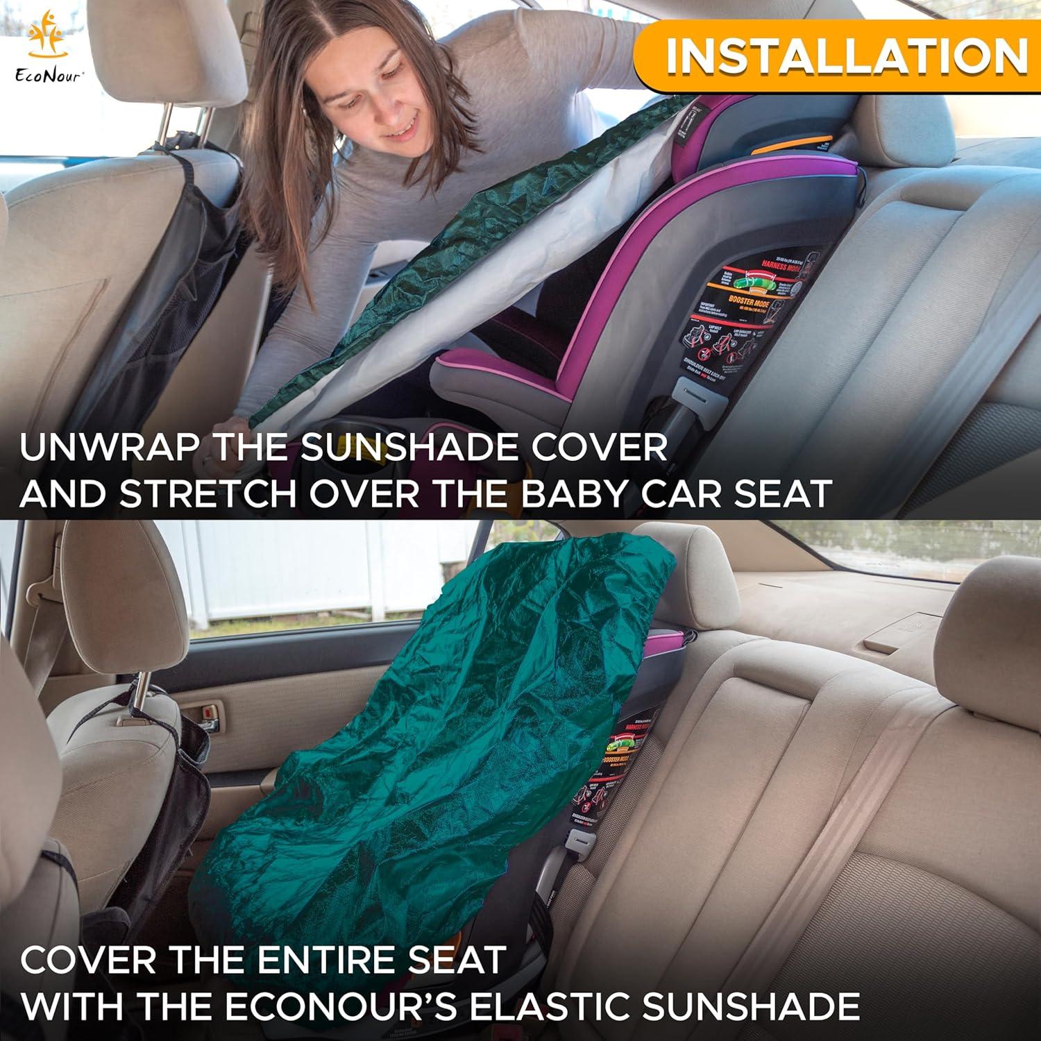 Simple Installation: Installing Our Car Seat Cover is very simple that even your kids can do it on their own. Pull the sunshade over to the toddler car seat directly. Elastic sizing will allow you to fit most of the baby's seat. Roll or fold up the sunshade cover so it can fit in small areas.