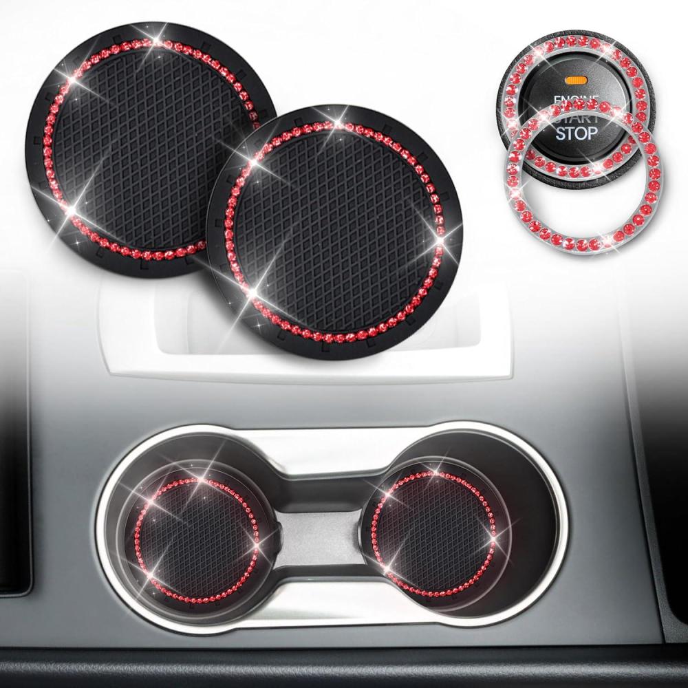 imageEcoNour Bling Cup Holder Insert 2 Pack with Push Start Button Ring 1 Pack  275 Inch Silicone Coaster Pad and 15 Inch Ring with Elegant Crystal Rhinestone  Car Interior Accessories BlackBlackred