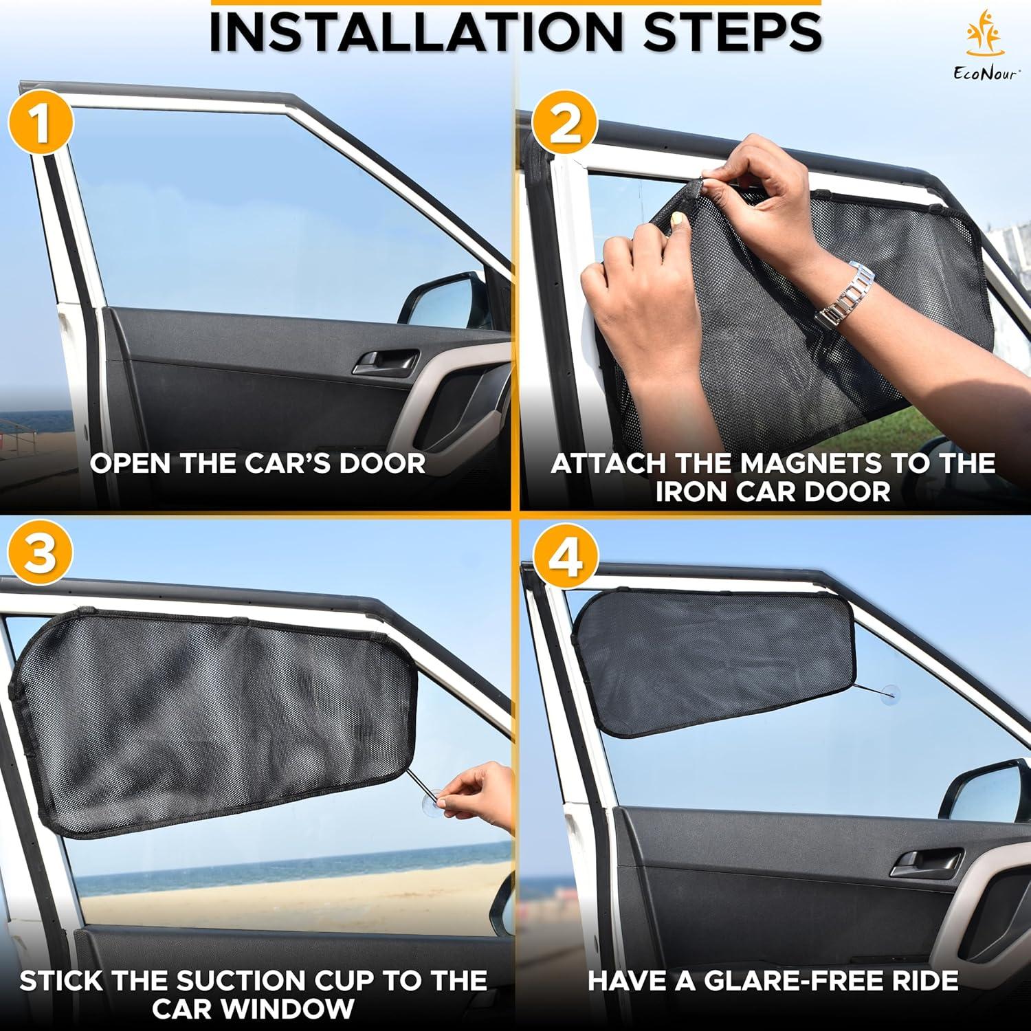 EcoNour Car Window Shade for the side window is made of protective mesh material which makes the interior of the car cooler! Keeps your driving more comfortable and also protects your car interior from aging. The deep black color not only gives your car a clean and classy look but also can protect your privacy. Our car window cover is equipped with five powerful magnets at the top that can attach to metal-framed windows, as well as a suction cup that can secure it firmly to the window. EcoNour Car Window Shade is portable and convenient to store. It can easily be opened by sliding. When the sunshade is no longer required, the side window can be rolled down without removing the curtain.