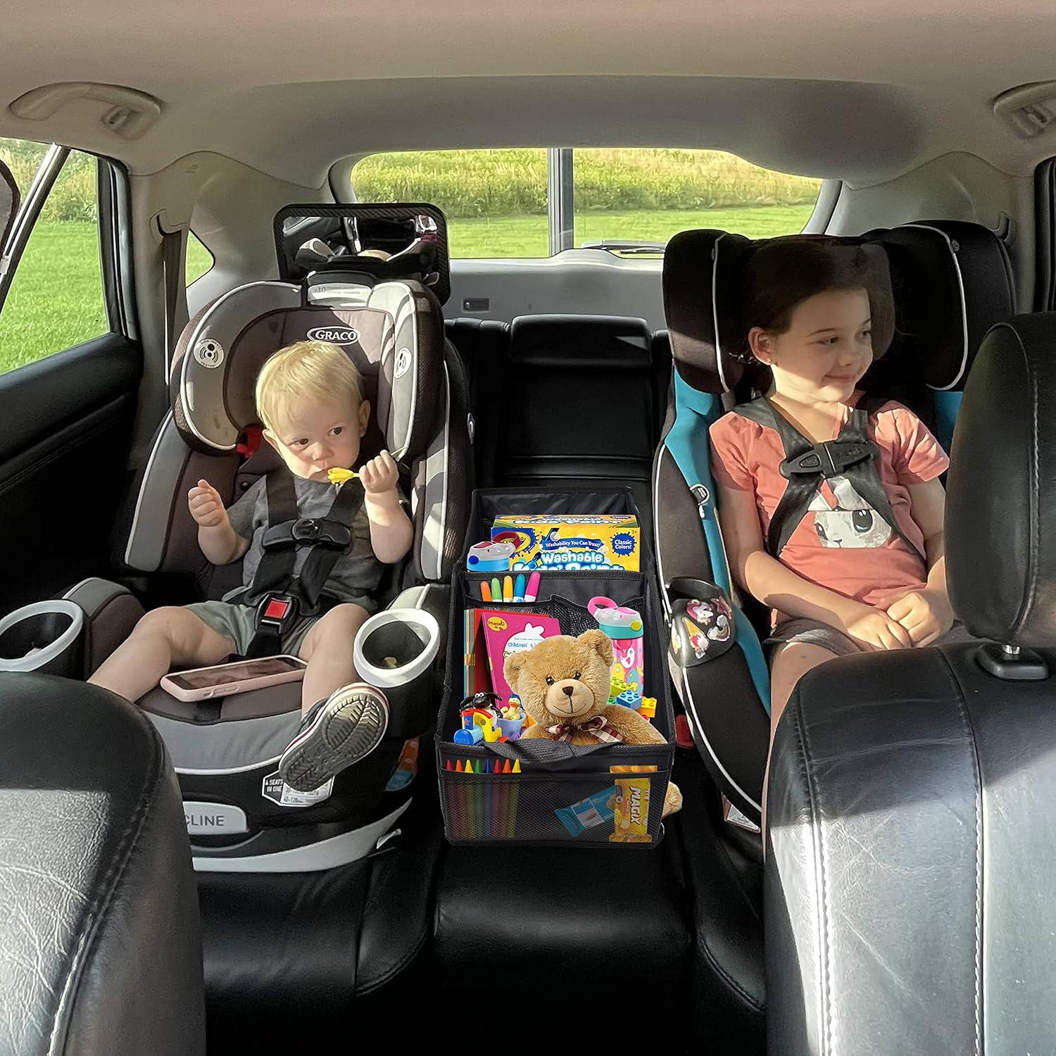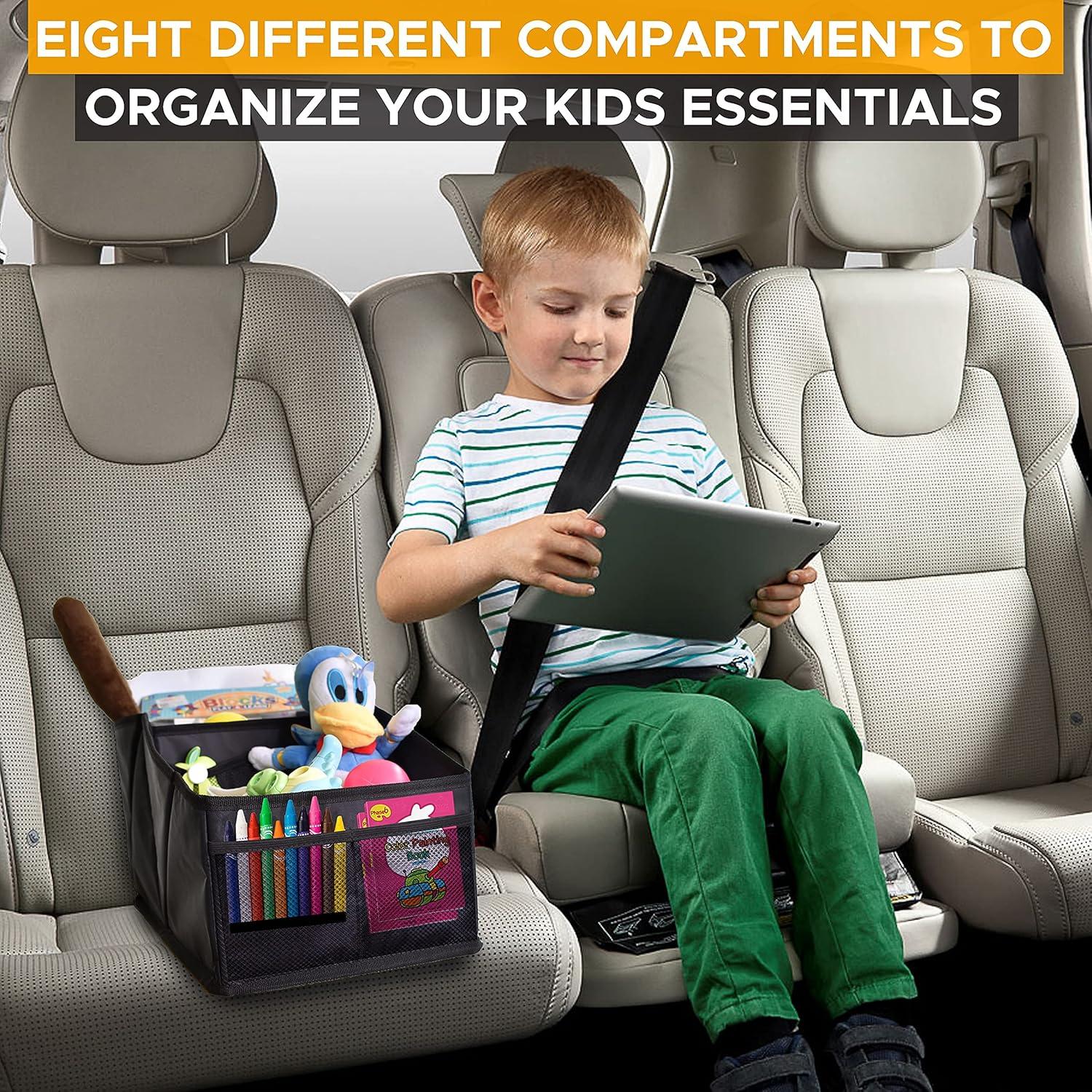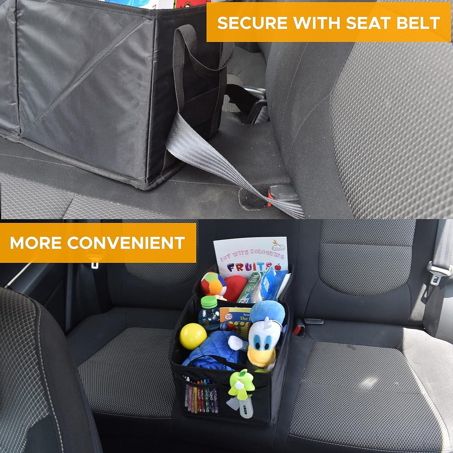 FOLABLE & EASY TO CARRY: Our Car Seat Organizer is easy to carry anywhere with the help of two ergonomic handles. The non-slip design at the bottom keeps the organizer in place, you can loop the seat belt to the kids organizer to secure it in place.