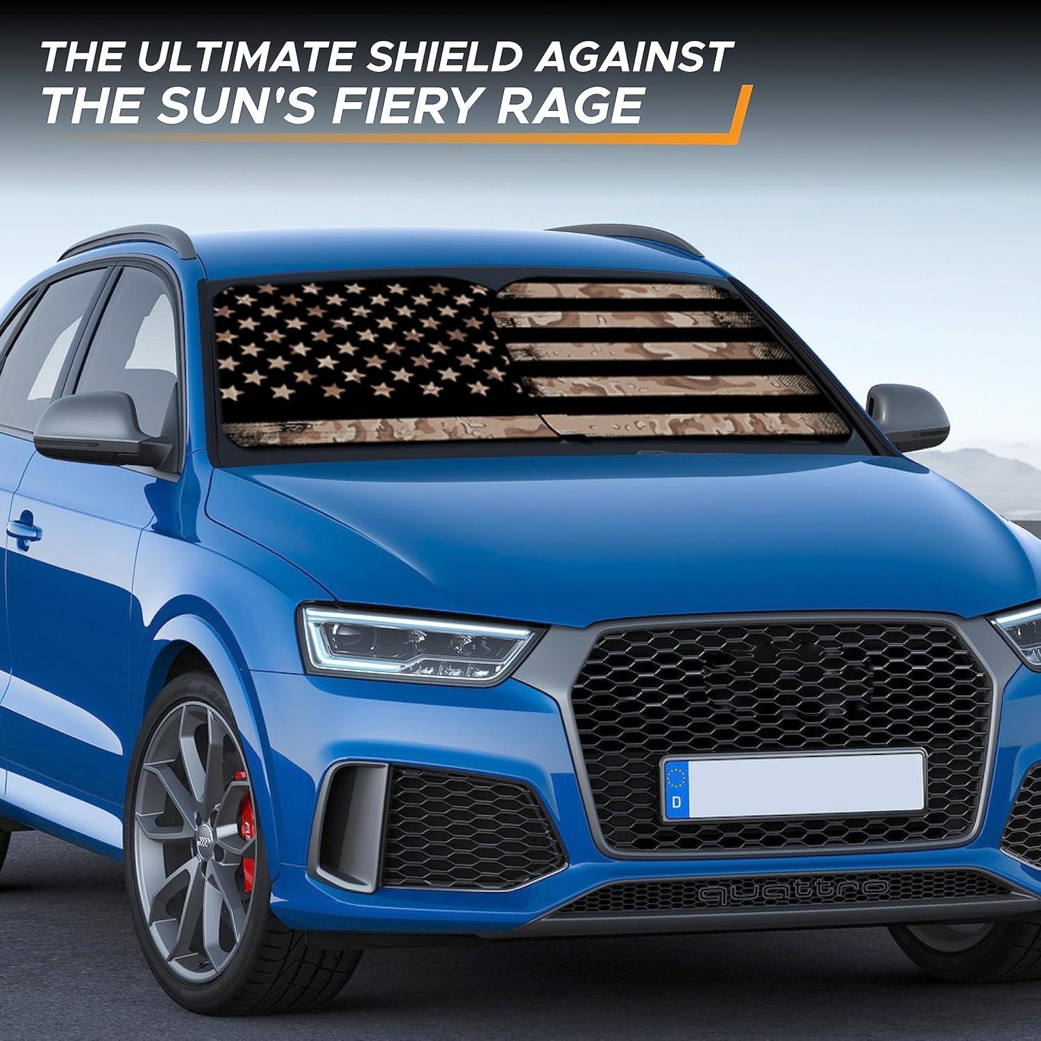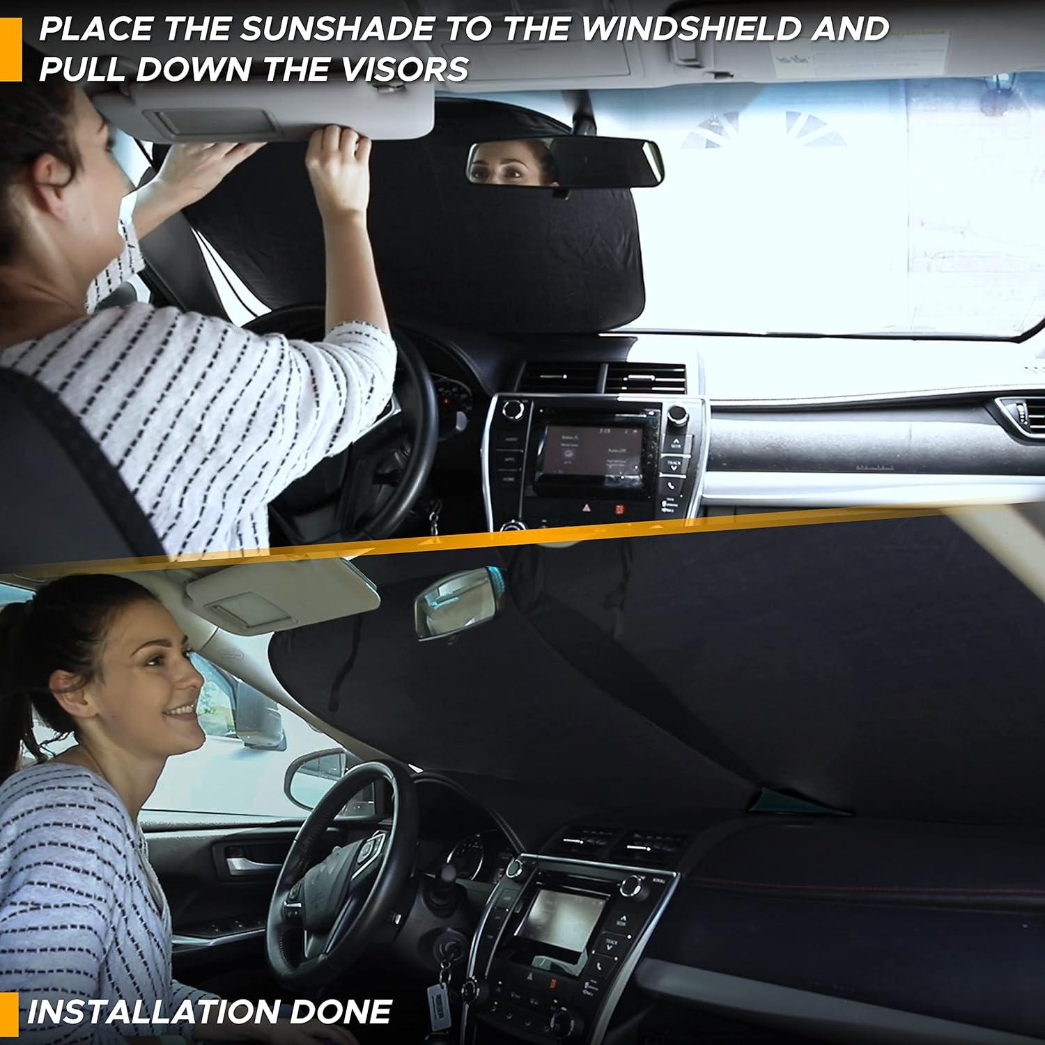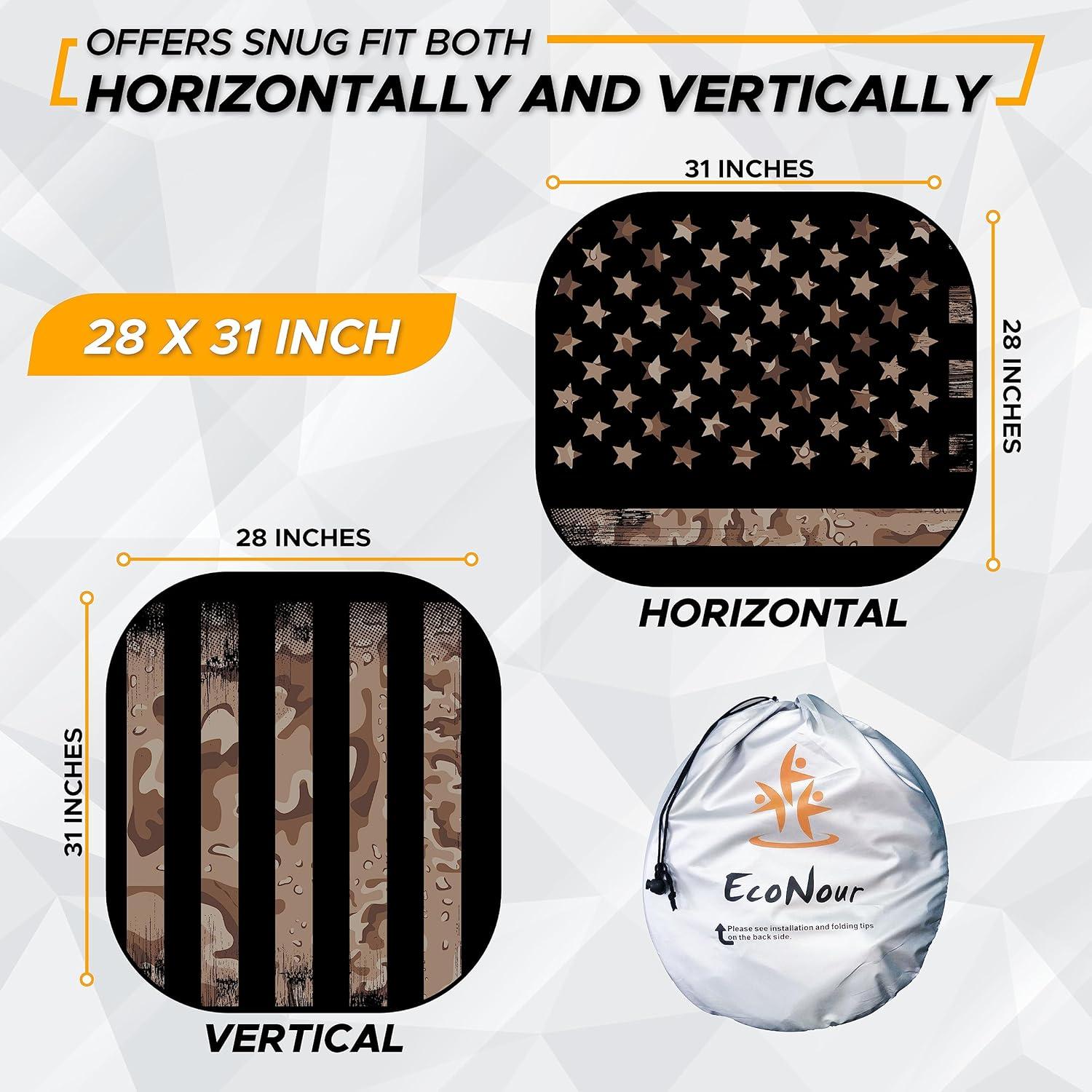 Installs Horizontally or Vertically: EcoNour’s Car Shades for Windshield features a two-piece identical rectangular sunshade (28 x 31 inches) that will fully encompass your vehicle’s visor windshield. It can also be installed either vertically or horizontally for a perfect fitting. Please refer to the size chart.