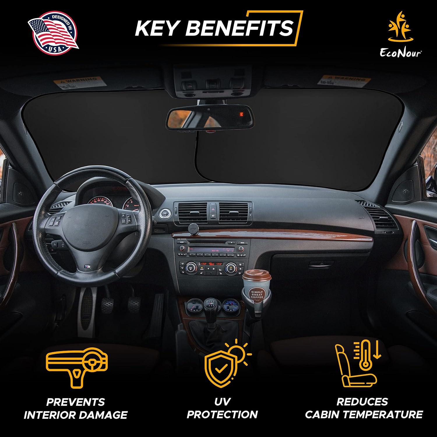 Exceptional Heat Reduction and Sun Blocking: EcoNour 2-Piece windshield visor is designed specially in a way to keep your car's interiors cool and comfy. It also prevents fading and cracking your dashboards by effectively blocking out the UV rays and sun’s heat inside your vehicle’s interiors, seats, dashboards, and other electronic devices.