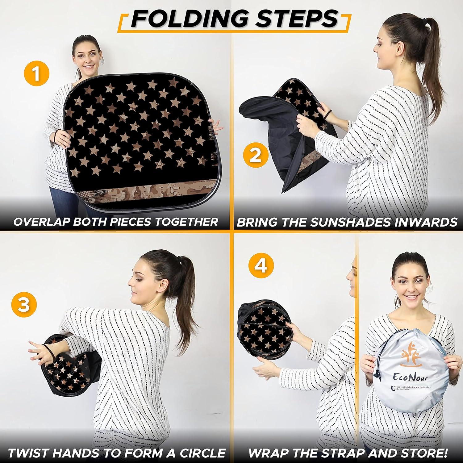 Astonishing Quality, Ultimately durable: EcoNour’s Sun Shade for car window is made out of a premium, fade-free, enduring, UV-reflective reinforced 240T Polyester which uses heat reduction technology to block a maximum amount of heat and UV rays from penetrating inside your car’s interiors.