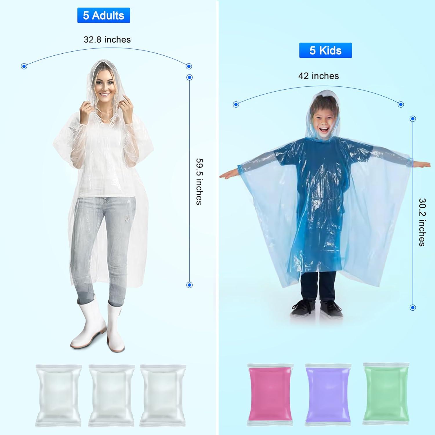 EcoNour Clear Rain Ponchos Family Pack | Emergency Clear Ponchos with Hood for Kids & Adults | Perfect for Disney World(Multicolor (5 Kids /5 Adults))