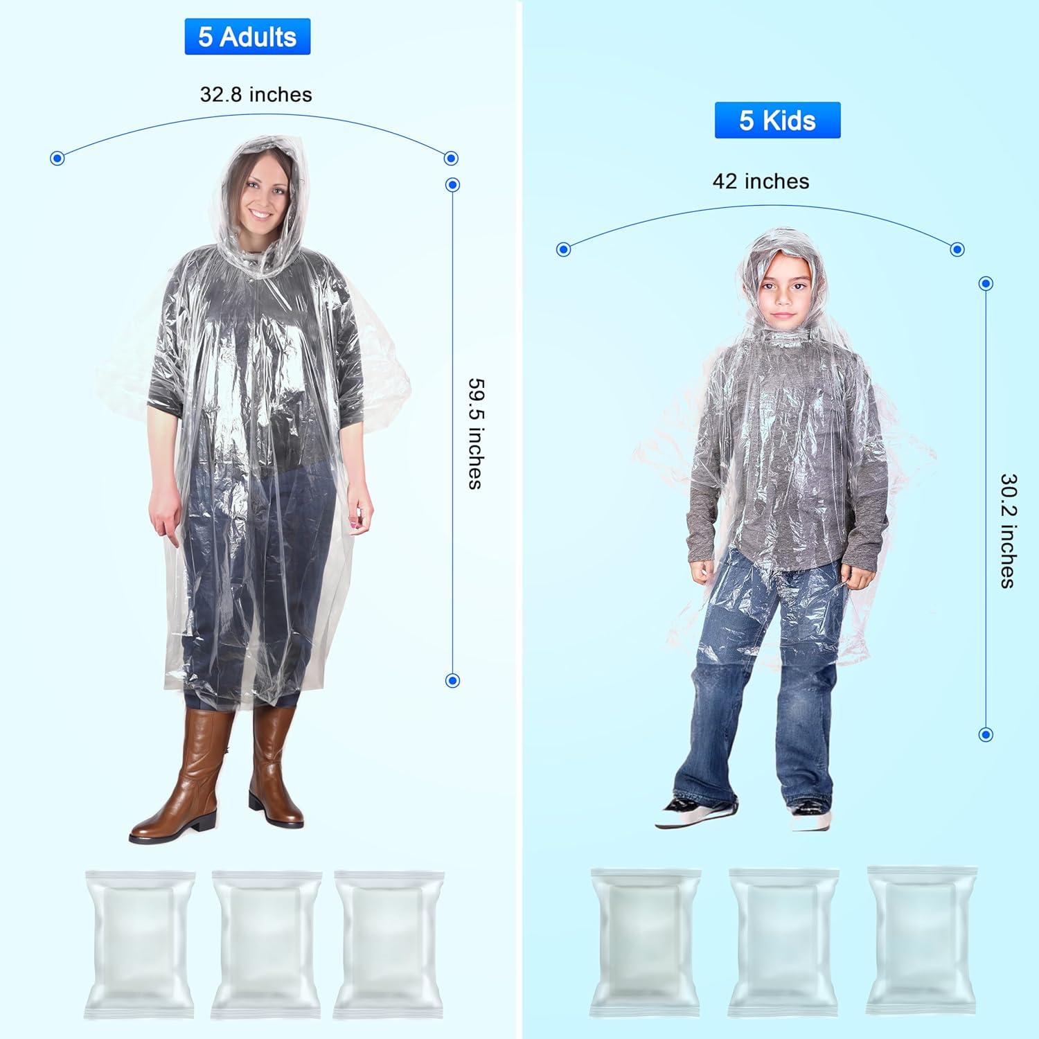 EcoNour Clear Rain Ponchos Family Pack | Emergency Clear Ponchos with Hood for Kids & Adults | Perfect for Disney World(Transparent (5 Kids /5 Adults))