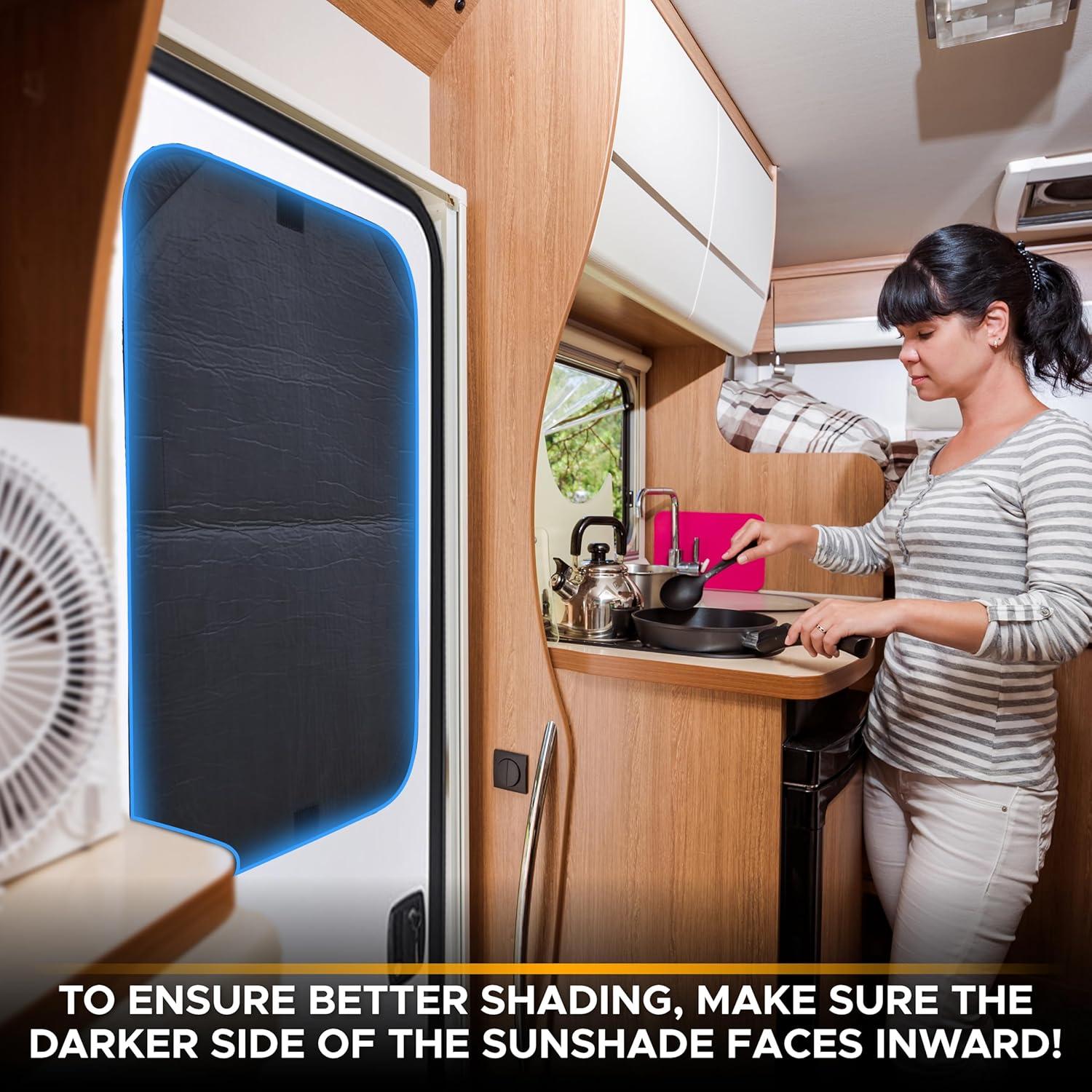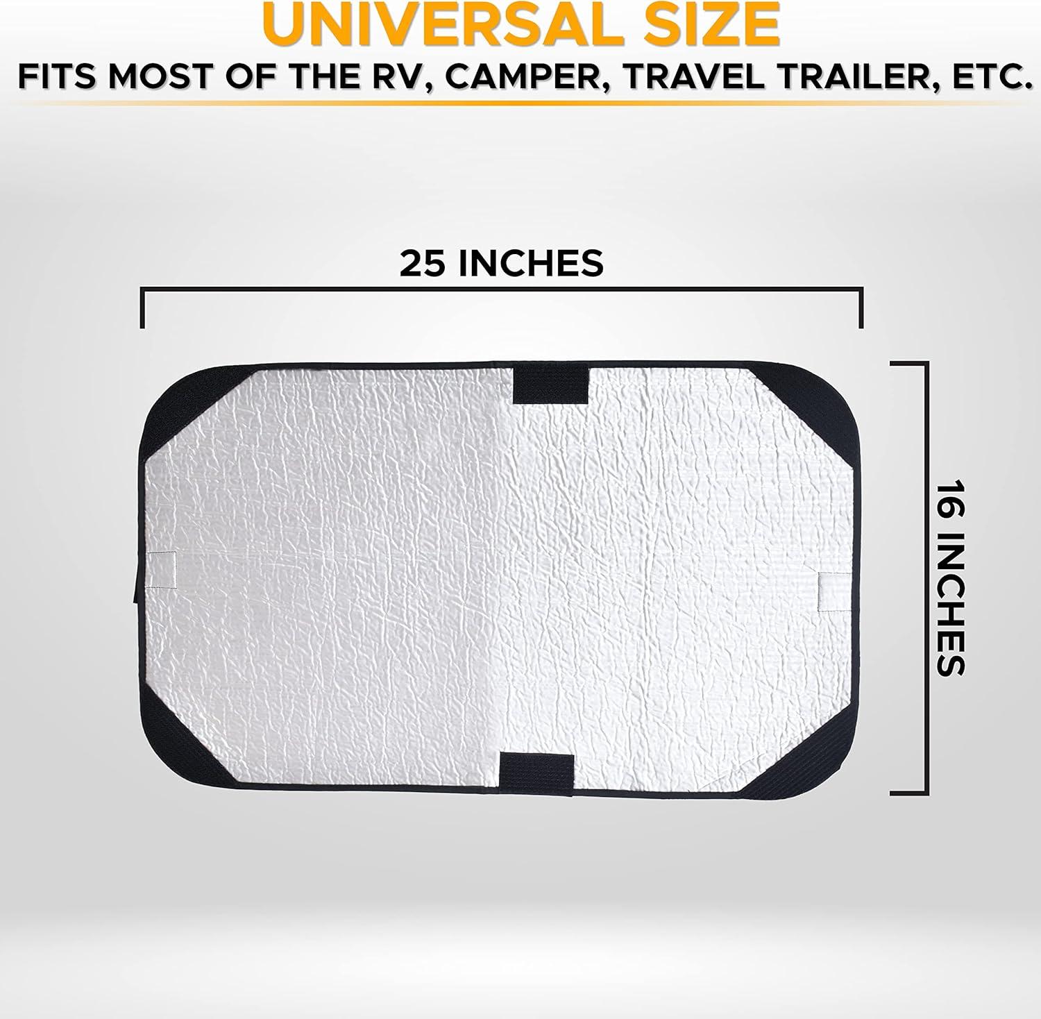 Impeccable Coverage: 25×16 inches of our RV sunshade fits most of the RV, Camper, Travel Trailer, etc. This sunshade blocks the sun's rays from the entry door window or side window which allows you to enjoy your journey.