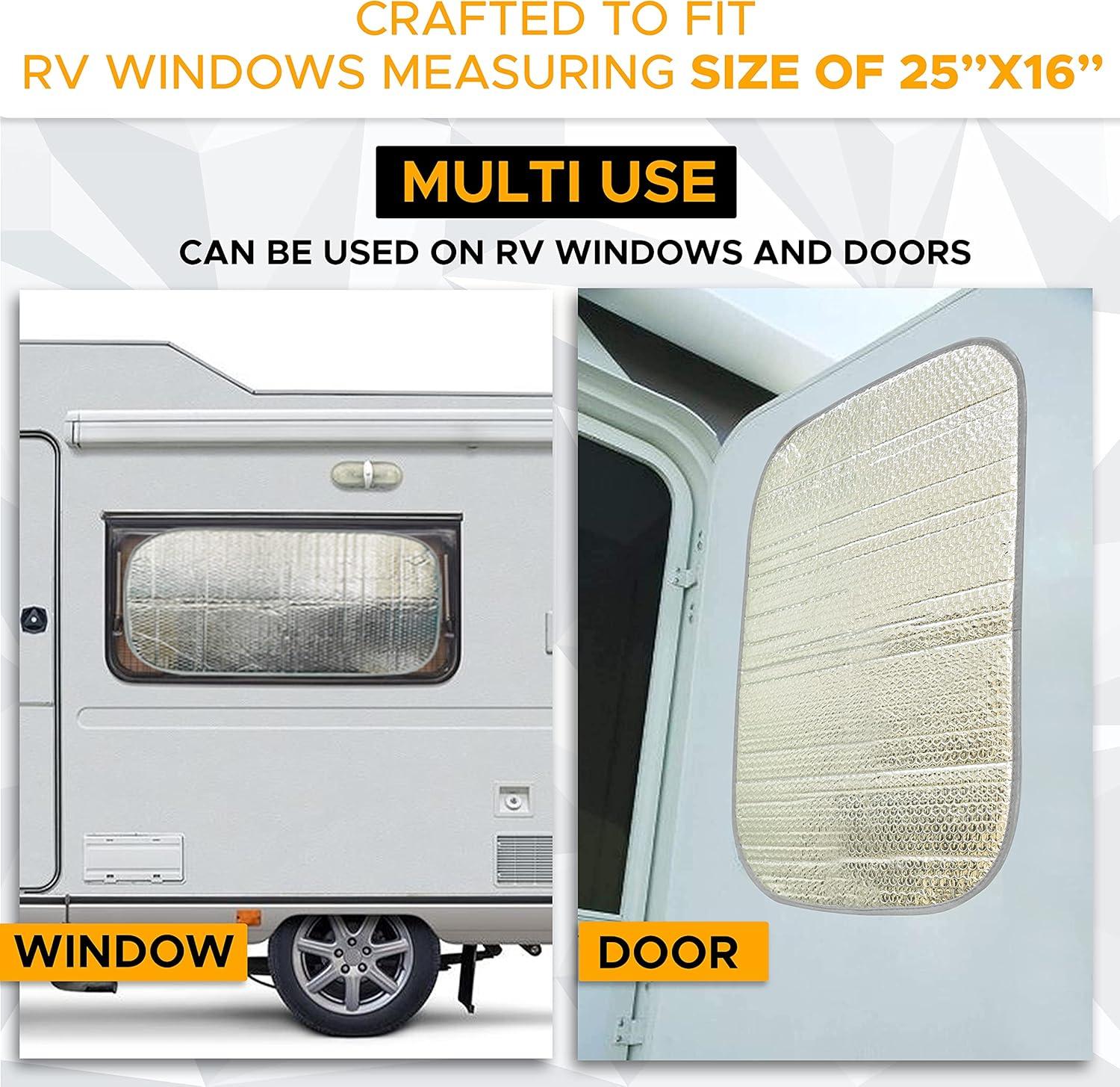 Impeccable Coverage: 25×16 inches of our RV sunshade fits most of the RV, Camper, Travel Trailer, etc. This sunshade blocks the sun's rays from the entry door window or side window which allows you to enjoy your journey.