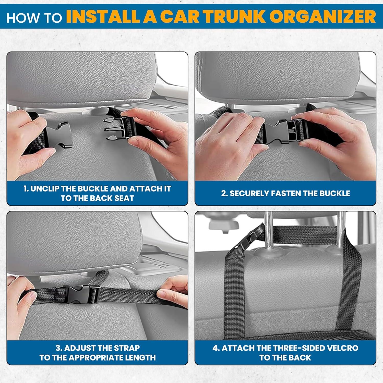 Stays in Place: Our automotive Trunk Grocery Organizer comes with adjustable tie-down straps to hold it in place. The fasteners and rubber panels at the bottom will prevent them from skidding or falling during sudden breaks and turns.