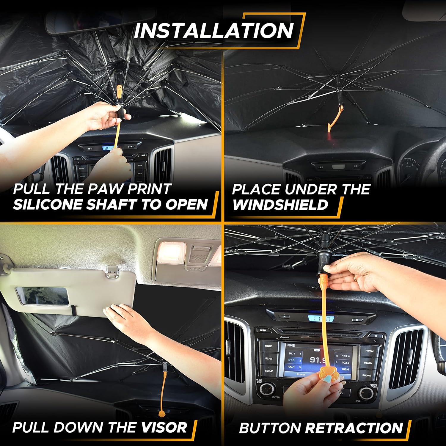 Installs and folds easily: As the first step, you need to pull the silicone shaft and open the umbrella. Once opened, place it under the windshield and pull down the visor. The auto retraction spring helps in removing the umbrella with one-touch button closure.