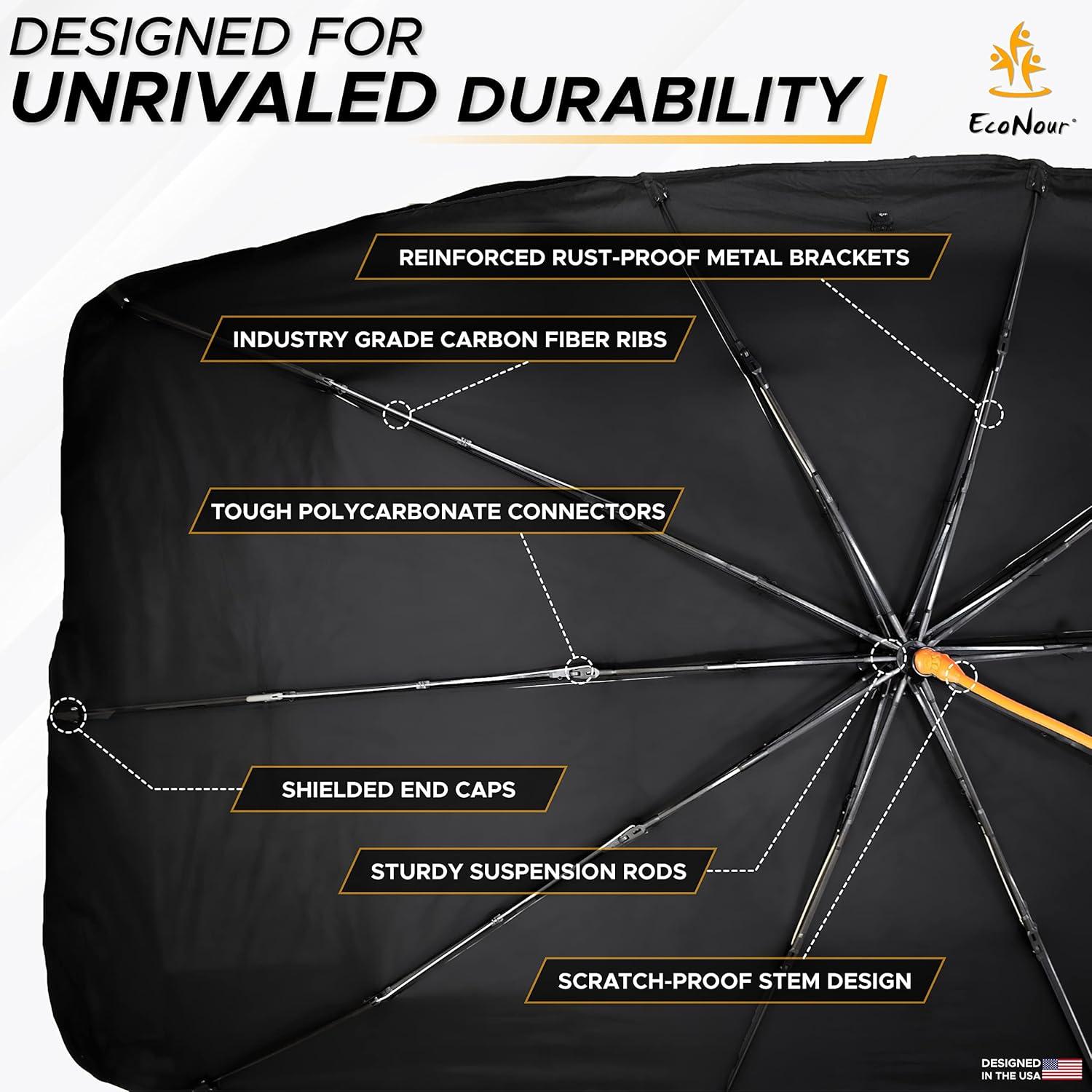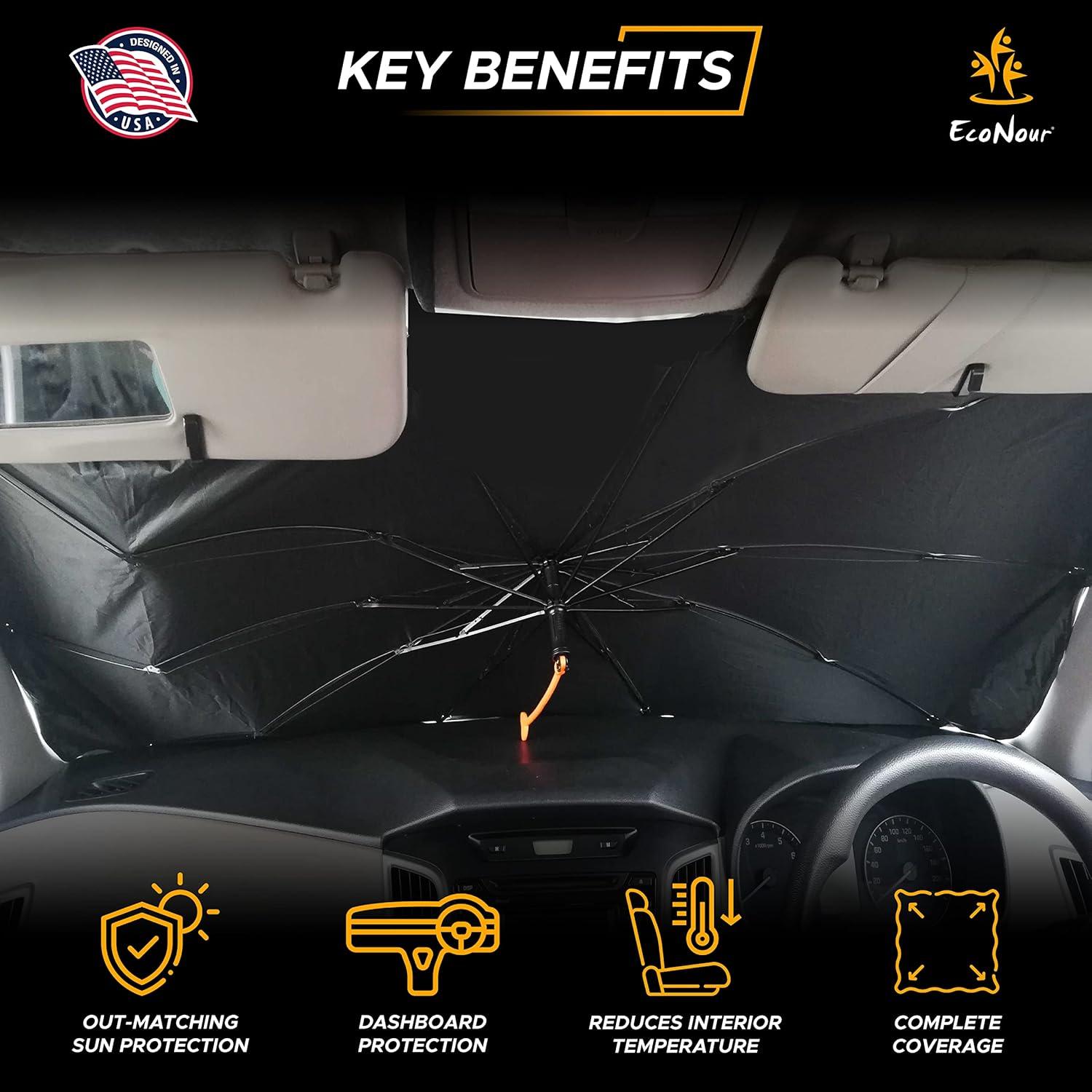 Superior Interior Protection: EcoNour's car windshield umbrella sunshade is made out of a durable, robust polyester with UPF50 that keeps your car interior at the perfect temperature and protects it from damage, every time!