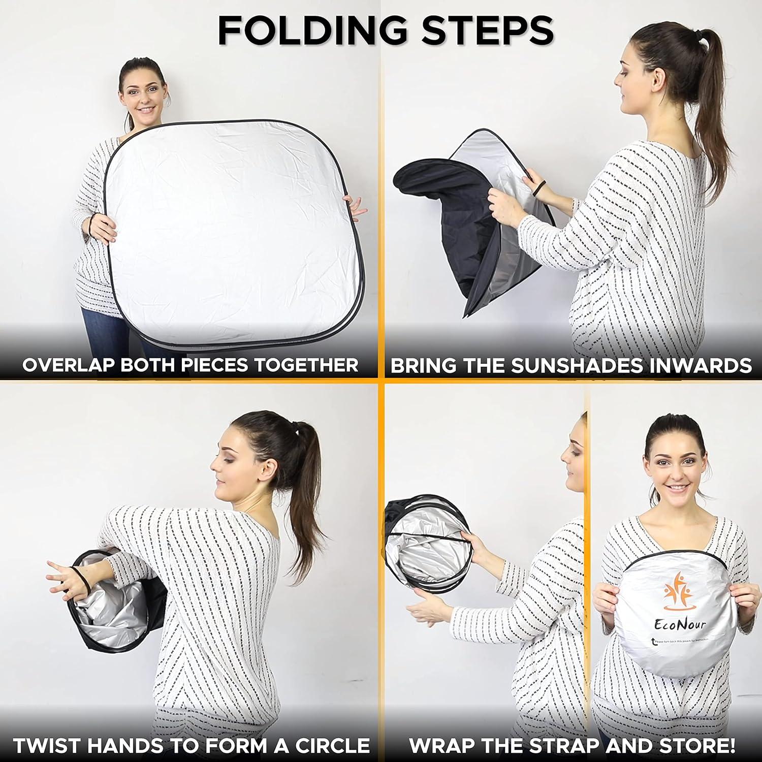 Perfect Fit for Your Car: Thanks to the compact storage pouch that comes along with the EcoNour’s Window Sunshade, you can store the EcoNour Car Windshield Sun Shade in your car’s door pocket or on the car’s dashboard when not using it.