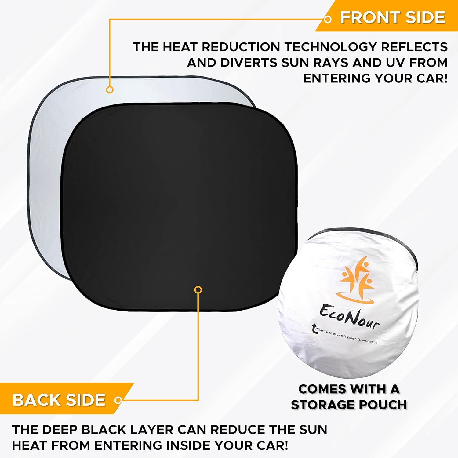 Sun Heat Reduction: EcoNour’s Premium car windshield sunshade protects your car and passengers from harmful UV rays and heat with its innovative 300T Polyester material. Keeps you cool and safe even during your hottest trips.