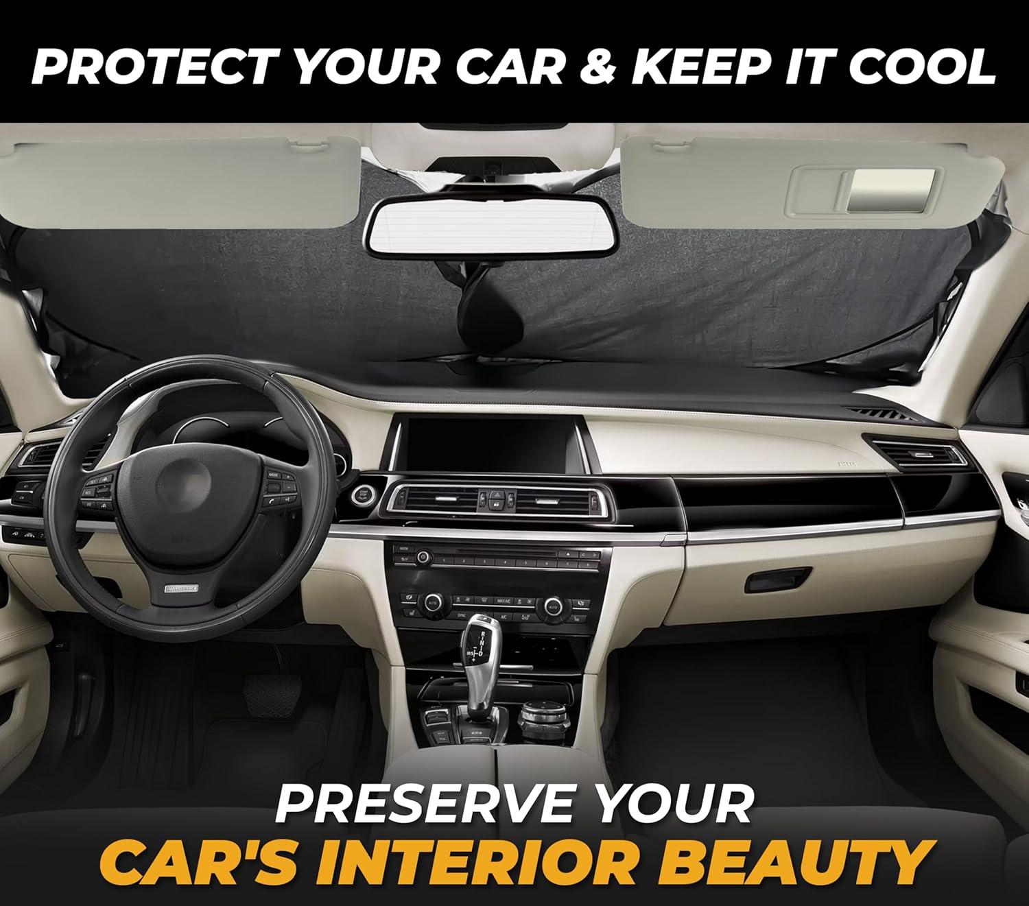 [Blocks Heat with Precision Keeps Your Cabin Cool] – Engineered to block up to 99% of harmful UV rays and sunlight, this sun shield acts as a thermal reflector that protects your dashboard, steering wheel, and leather seats. Truck front window shades maintains cabin temperature, by reflecting heat before it enters your cabin.